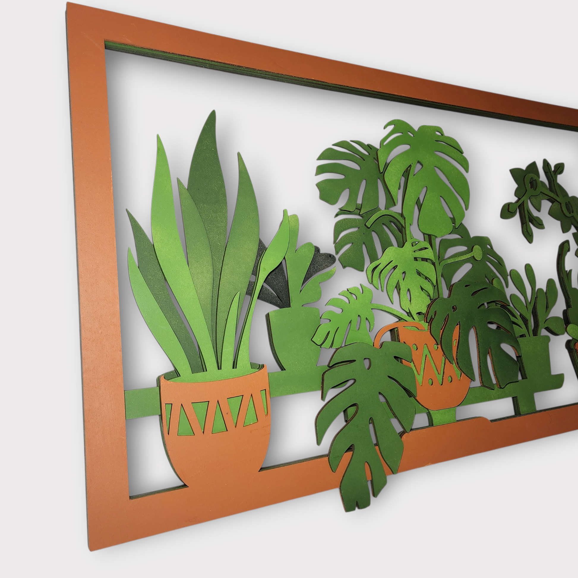 Add a splash of nature to your walls with this colorful multilayer laser cut wall art featuring a lush arrangement of indoor plants in decorative pots. The layered design gives depth and dimension, while the bright greens and terracotta tones make it pop — perfect for plant lovers, modern interiors, and cozy corners.