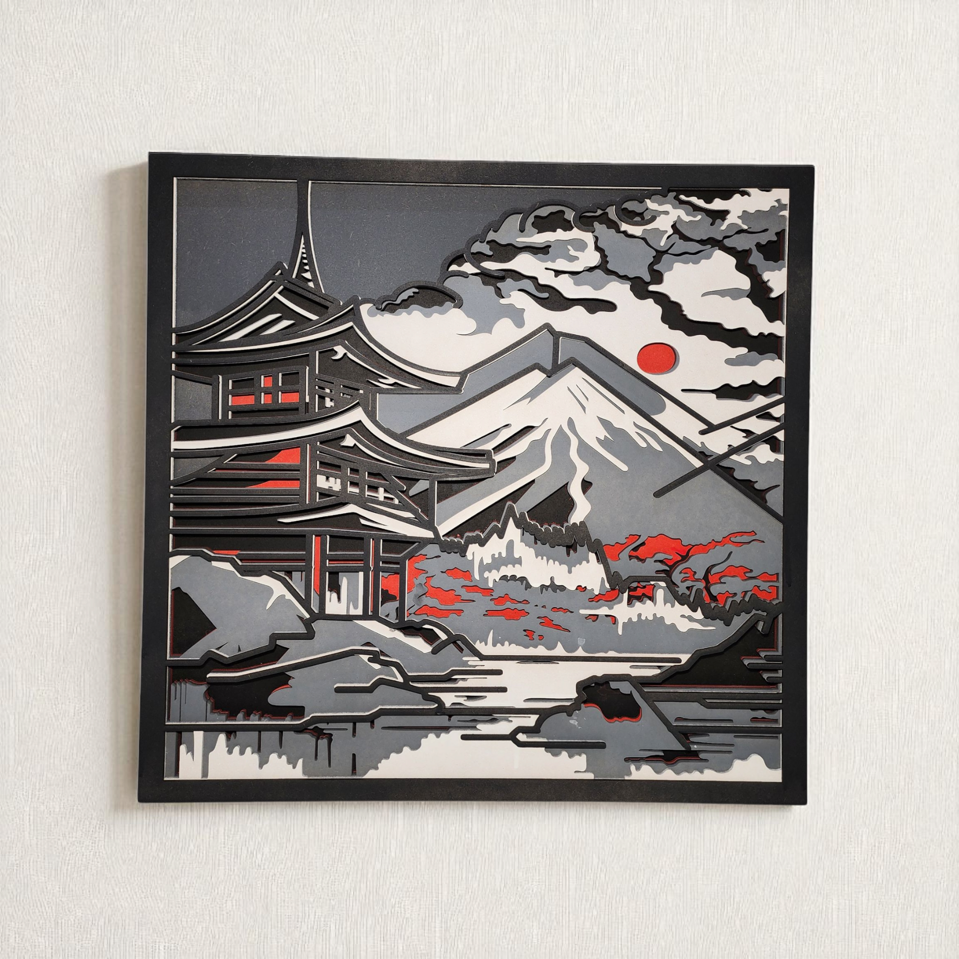 Add striking depth and color to your décor with this multilayer laser cut wall art featuring a traditional Japanese temple, the majestic Mount Fuji, and a vivid red sun. Each intricately cut layer brings the scene to life with dimension and dynamic contrast, blending shades of black, grey, white, and red for a visually captivating effect. This piece is perfect for lovers of Japanese culture, scenic landscapes, and bold artistic statements.