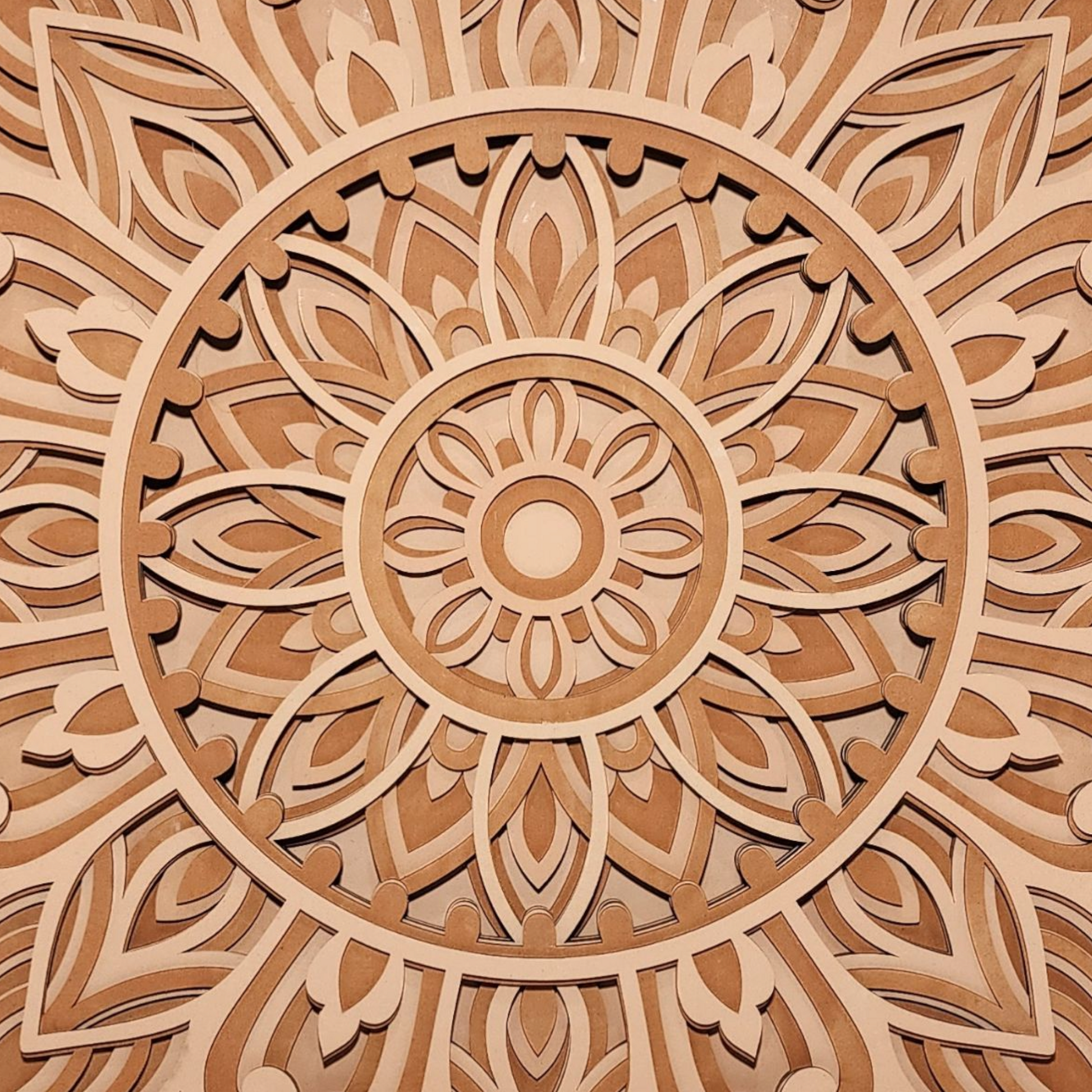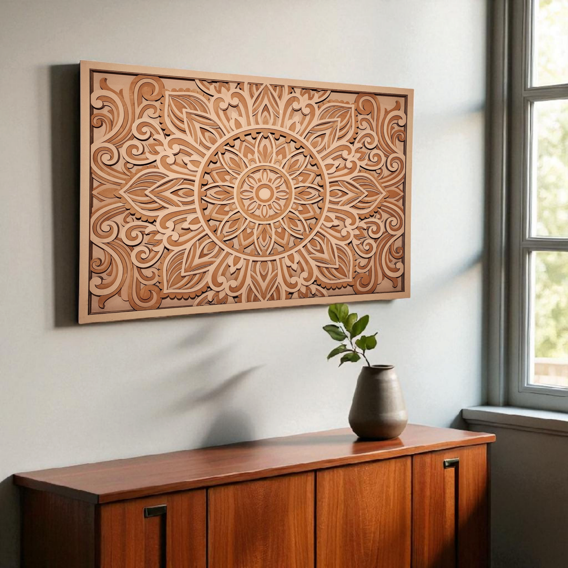 Bring a touch of rustic elegance and spiritual harmony into your space with this stunning multi-layer mandala wall art panel. Designed with precise laser-cutting technology, this piece showcases a mesmerizing floral mandala at its core, surrounded by rich ornamental detailing and dimensional depth. Its warm earthy tones and intricate layering create a natural wood aesthetic, making it a perfect addition to boho, rustic, or contemporary interiors.